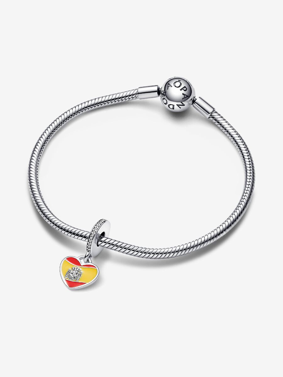 Made of sterling silver, this Engravable Spain Flag Pendant Charm captures the essence of Spanish national traditions. The charm features the Spanish flag in red and yellow enamel on one side, while the other has a polished finish so you can add and customize it with your message. A heart-shaped disc with a flat profile adds a touch of heart and the row of pavé in the hook provides a subtle shine. With the option of engraving on one side, this pendant is the perfect symbol of your favorite memories. Accompany it with your favorite pendant to always have your favorite moments close or give it to someone special.